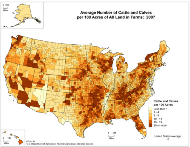 Yet, this is somewhat misleading. Obviously, not all cows come from Nebraska, Kansas, Oklahoma, and Texas. As this map shows.